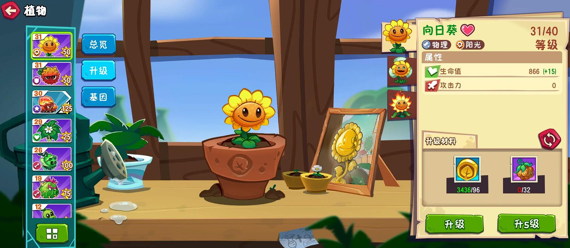 作为阳光生产核心,向日葵应优先种植在前排安全位置。游戏初期系统会自动赠送3株1级向日葵,建议在第一个能量槽满时就立即种植。每株基础向日葵需要100阳光,产出速度为25阳光/30秒。升级到3级后,阳光产量提升至30/25秒,并解锁阳光爆发技能,可一次性产出75阳光。但是注意在泳池关卡要选择莲叶向日葵,在屋顶关卡则需使用花盆向日葵,这些变种需要完成特定关卡解锁。