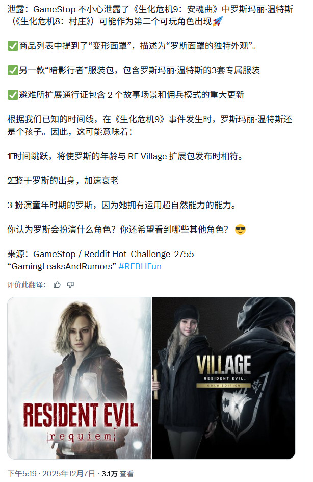 GameStop网站上《生化危机9:安魂曲》PC版豪华铁盒版的商品信息中提到了萝丝(Rosemary Winters),她正是《生化危机7》和《生化危机8》主角伊森的女儿。截至发稿时,该商品信息仍未更新,其中显示豪华版包含“萝丝玛丽面罩的独特外观”和“萝丝玛丽的3套专属服装”,以及一个扩展通行证。