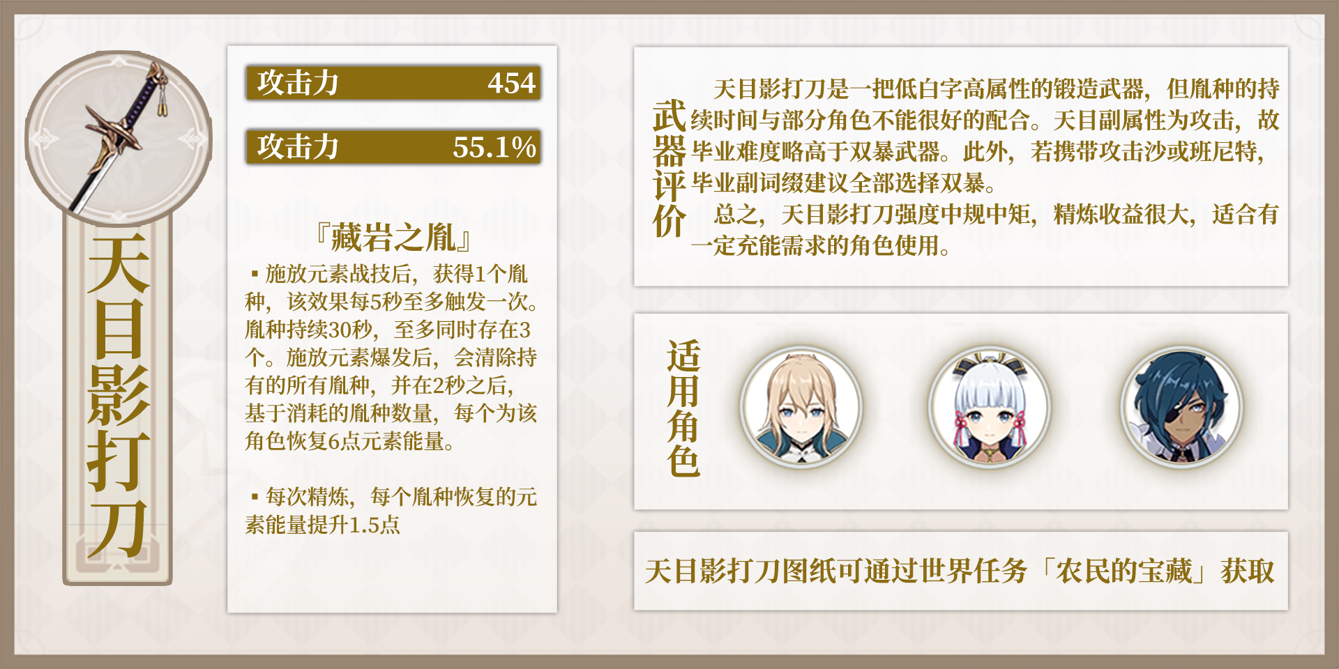 天目影打刀可以一定程度上缓解充能压力,但胤种与部分角色对不上,例如神里在循环中就只能吃到两层天目。