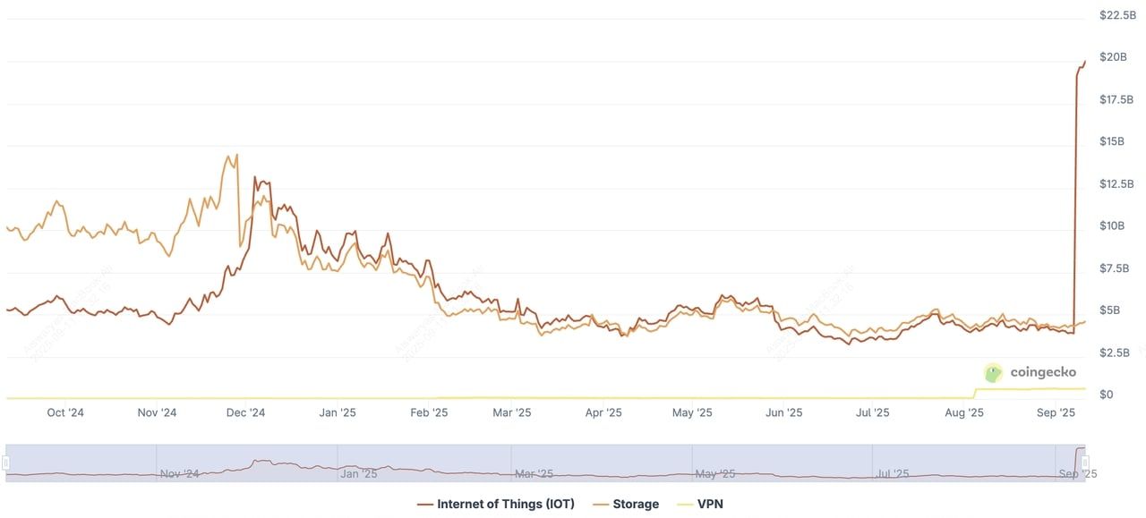 DePIN 领域在 2025 年进入了一个新的成长阶段,截至 2025 年 9 月,其总市值已攀升至 192 亿美元,而一年前仅为 52 亿美元。这代表着近 270% 的年增长率,凸显了尽管市场波动,其依然拥有结构性动能。DePIN 代币目前约占加密货币总市值的 0.5%,反映了其从小众基础设施实验向 Web3 生态系中公认的资产类别转变。