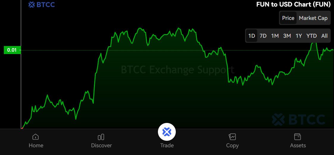 截至撰写本文时,FUN 的交易价格为 0.0137 美元,市值为 1.479 亿美元,24 小时交易量高达 9680 万美元。FUN 代币 24 小时变化率为 8.11%,过去一小时内波动幅度较小,为 -5.01%。