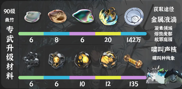 ① 金属液滴系列:凝素领域·熔毁废都(瑝珑归墟港市焚焰海)、凝素领域·赦罪庭园(黎那汐塔遗颂河谷右侧)