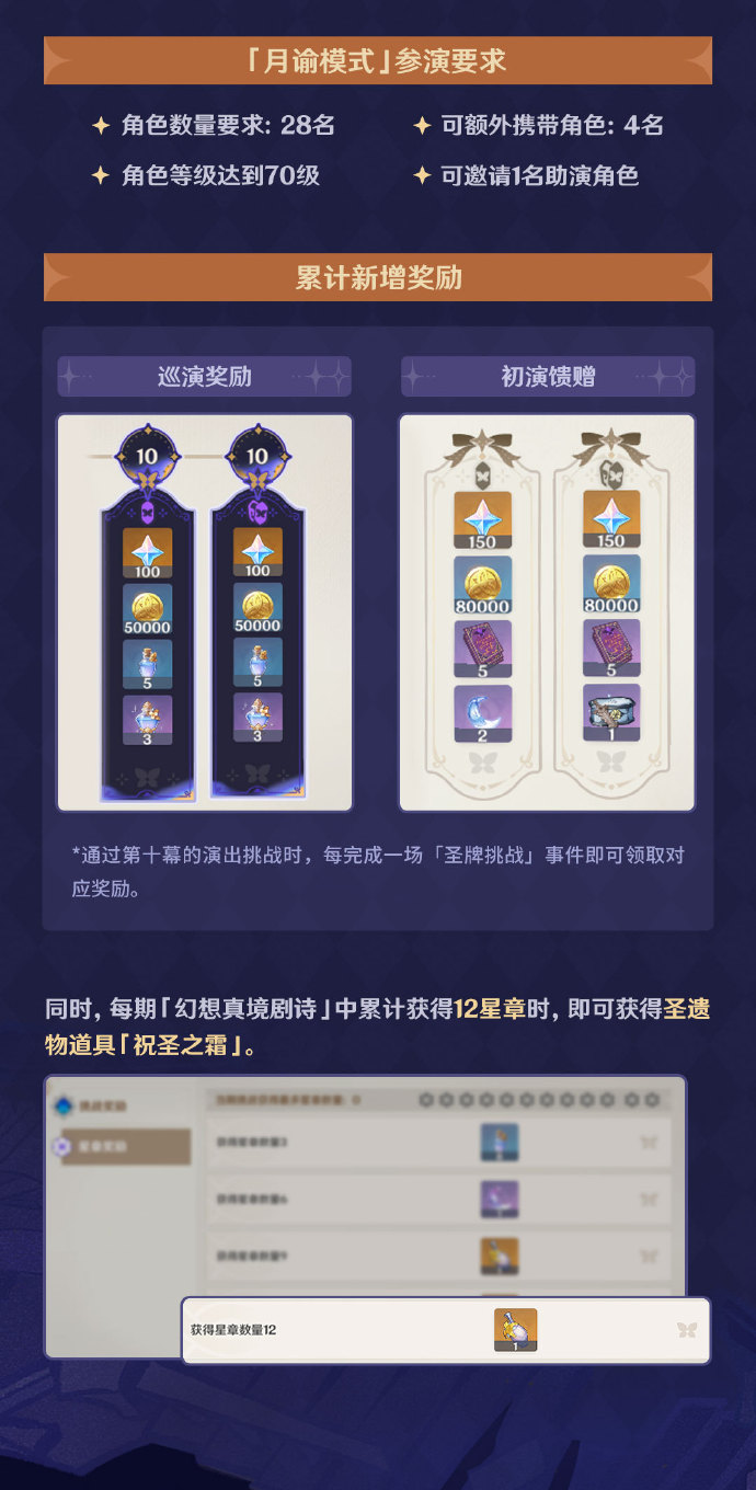 获得方法:参与全新玩法「月谕模式」,通关并完成演出过程中出现的2个额外挑战,即可在第十幕的演出挑战后抽取特别道具「月谕圣牌」,此外,完成挑战还能获得原石、圣遗物道具「祝圣之霜」等丰厚奖励。