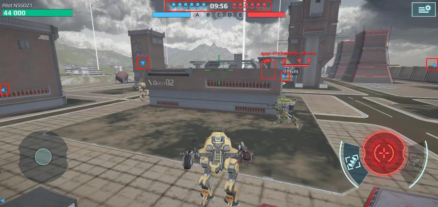 3、当我们发现敌人的位置时,绿色的十字箭头对准红色多边形框,然后开始射击,注意控制好位置,以防被敌人集中;