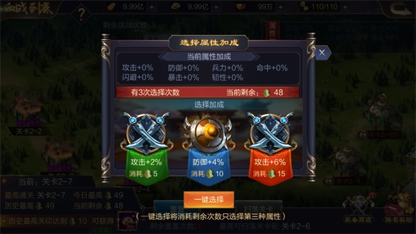 3.每5关会有一次属性加成的机会,使用关印可以在选择属性加成界面换取属性加成,以此提升武将属性冲刺更高关卡。