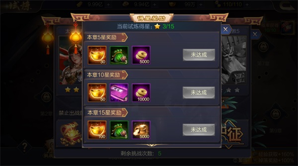 2.若当前不能三星也没有关系,待战力提升之后,返回去再进行挑战完成三星,依旧可以领取到三星挑战任务的奖励。