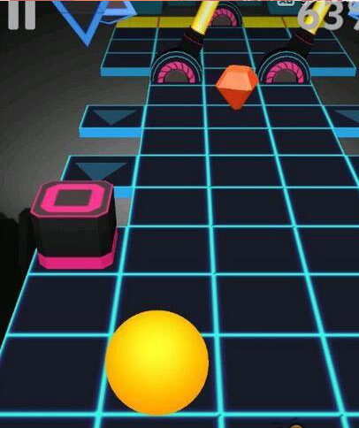 首关“云”的场景下,没有太难的拐角和过多的障物,沿着直线载球地面跑,不要碰到两侧凸起的方块,达成满钻通关较易,此图景只需一星就达标。期间无需上滑使球跳起,方向最重要,会自动跃过方块,只需操纵落点方位,遇到红色图案的钻石,滚到所在位置吃掉,一路沿着缝隙处穿滑而过即可。