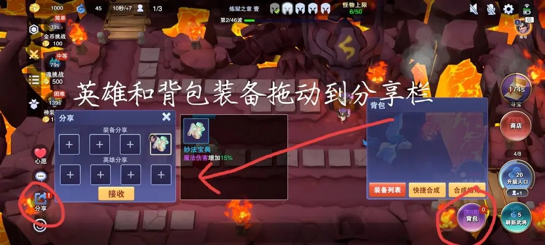 打开分享栏可以将自己的英雄和装备拖动到分享栏分享给队友(队友拿免费),自己也可以拿队友分享的(同样免费)。