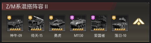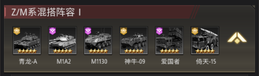 阵容以Z、M系各自强大的输出作为组建核心,倚天-15、爱国者是阵容的输出核心,能抗能打,神牛-09和M1130提供阵容的续航能力,搭配坦度强大的青龙-A和M1A2,是目前最强的阵容之一