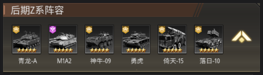 以Z系为主作为阵容组建,青龙-A可以牵制敌方攻击,倚天-15和落日-10是阵容的双核输出极具破坏性,神牛-09能给队伍带来治疗的同时又能给予敌军虚弱状态,配合勇虎,可使双核战车提高存活率