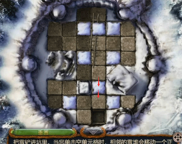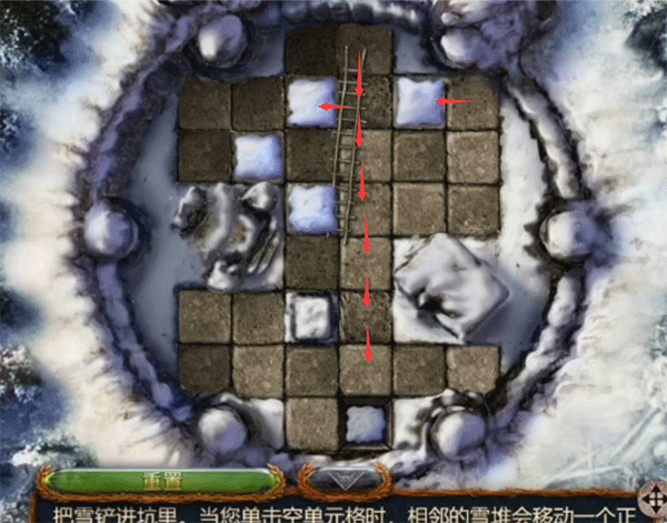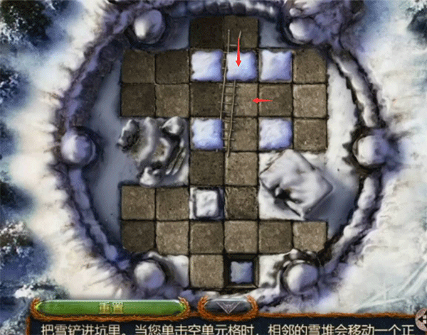 7.先铲右上角雪堆,点击右侧,再点击上方,一路向下点,即可将其铲进坑中,注意,点击过程中会使左上角雪堆左移1格。