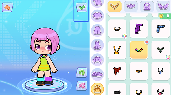 3、为角色挑选五官、衣着等个性化元素,完成后点击页面顶部的勾选按钮确认。