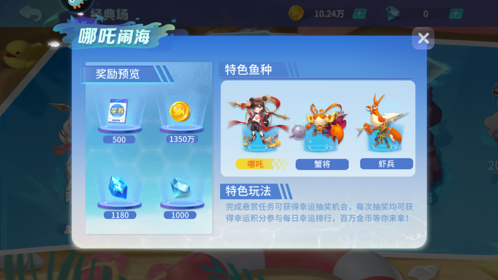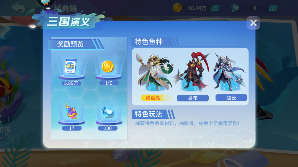 特色玩法:捕获特色鱼拿材料,抽武将,兑换上亿金币奖励!
