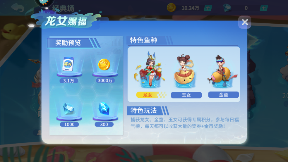特色玩法:捕获龙女、金童、玉女可获得专属积分,参与每日福气榜,每天都可以收获大量的奖券+金币奖励!
