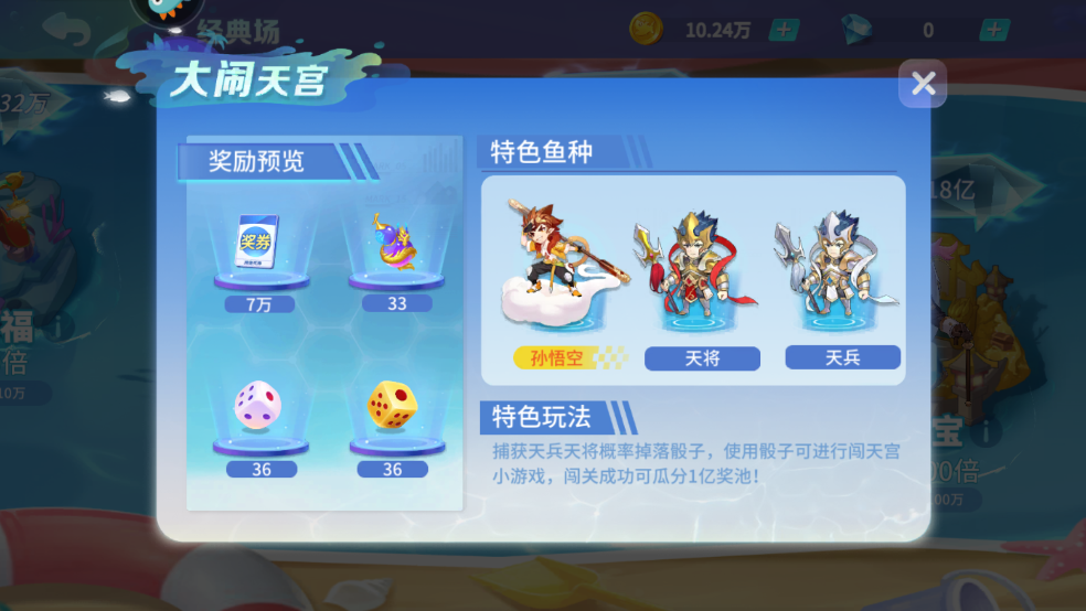 特色玩法:捕获天兵天将概率掉落骰子,使用骰子可进行闯天宫小游戏,闯关成功可瓜分1亿奖池!