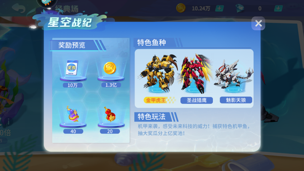特色玩法:机甲来袭,感受未来科技的威力!捕获特色机甲鱼,抽大奖瓜分上亿奖池!