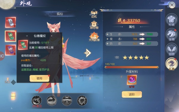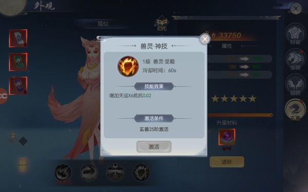 五星满时玄兽可进阶,进阶后会解锁新的玄兽外观和玄兽技能。