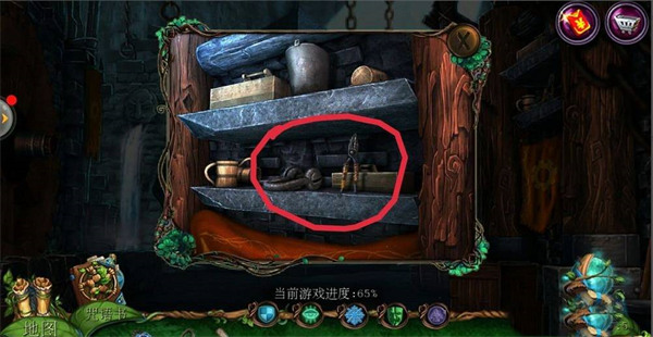 2、点击左边场景【哥布林房间】,点击中间下面的齿轮;在齿轮旁边拿到【铁链】;用【八边形钥匙】打开机关,在地上拿到【镰刀】。