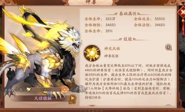 神兽增益:生命263万、攻击55500、物防34650、法防34650、生命35%