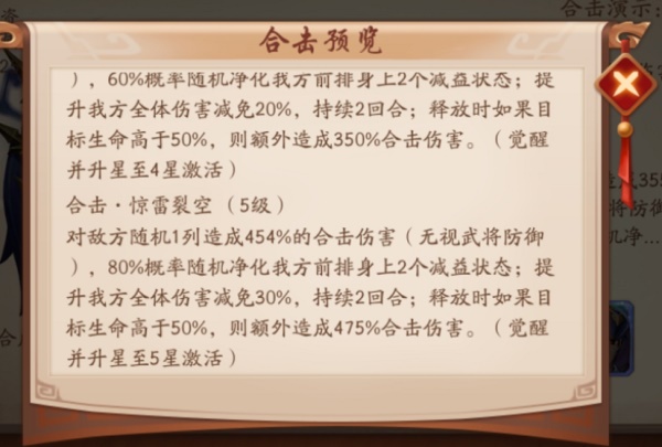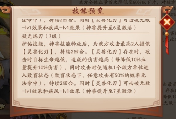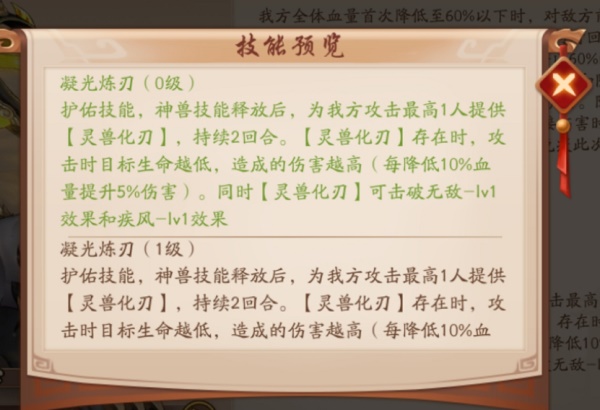 护佑技能,神兽技能释放后,为我方攻击最高1人提供【灵兽化刃】,持续2回合。【灵兽化刃】存在时,攻击时目标生命越低,造成的伤害越高(每降低10%血量提升5%伤害),同时【灵兽化刃】可击破无敌lv1效果和疾风lv1效果。(0级)