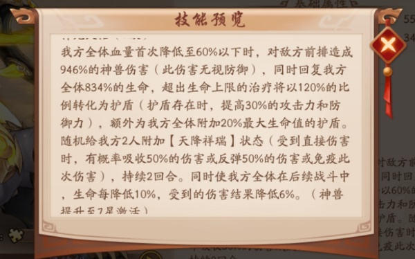 我方全体血量首次降低至60%以下时,对敌方前排造成446%的神兽伤害(此伤害无视防御),同时回复我方全体393%的生命,超出生命上限的治疗将以60%的比例转化为护盾(护盾存在时,提高10%的攻击力和防御力),额外为我方全体附加10%最大生命值的护盾。随机给我方1人附加【天降祥瑞】状态(受到直接伤害时,有概率吸收30%的伤害或反弹30%的伤害或免疫此次伤害),持续2回合(0级)