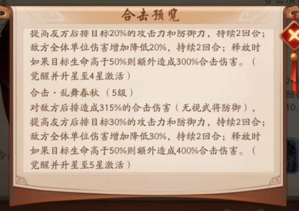 解析:小编推荐的第二个兵符——乱舞春秋。同样作为紫金兵符不受到血脉压制,在貔貅给予敌方前排的同时,乱舞春秋补充了对敌方后排的打击,同时在貔貅给予己方攻击防御的增益下,乱舞额外又补充了己方后排的攻防。同时在貔貅给予己方伤害增加的同时,限制敌方的伤害增加,让双方的伤害出现一定的差距。同时在敌方后排血量高于50%的时候,还拥有额外伤害,最高系数可拉到715%,效果还是肉眼可见的。
