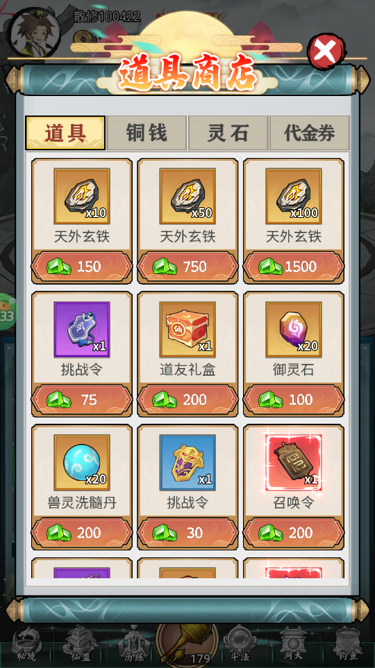 6、在道具商店中,玩家可以还可购买天外玄铁、挑战令、御灵石等等。
