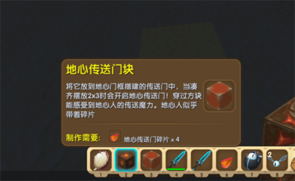 制作地心传送门块,通过【制作台—常用标签页】用地心传送门碎片合成,地心传送门碎片通过击杀地心人掉落。