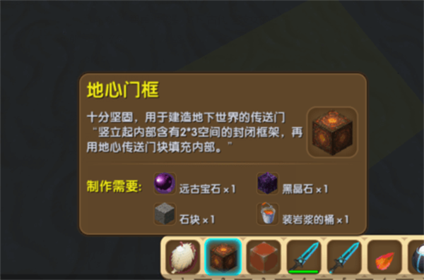 合成地心门框,通过【制作台—建筑标签页】用远古宝石和黑晶石、石块、装满岩浆的铁桶合成。