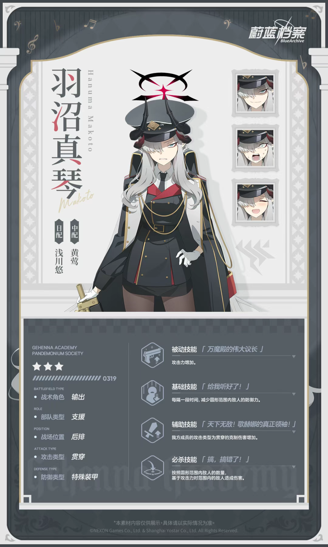 为了在歌赫娜的特别宴会上也能一如既往地辅佐日奈,自己也果断穿上了礼服。她平时处理事务的能力本就滴水不漏,受到风纪委员会众成员的敬仰,而这次她会更上一层楼,以完美特工的身份大显身手……自信满满的亚子如是说。