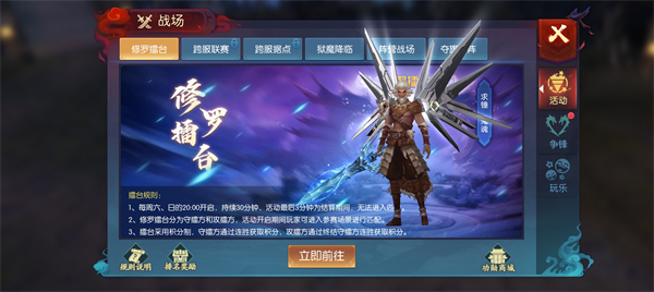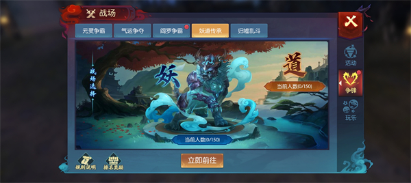 3、战场分为妖法传承和道法传承两个场景,活动时间内,玩家可根据自己的喜好选择任一场景进入,中途可退出和切换场景,积分保留。