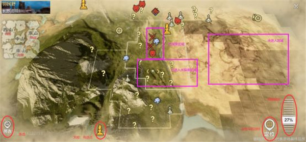 点击游戏 界面最左上角打开地图,右下角缩放选项拖动即可调整地图比例,定位选项可以设定导航目的地。地图中当前尚未进入的区域不显示细节,已进入未探索的区域地图上会显示问号,问号经探索后会出现对性的图标,具体图标介绍还请移步主攻略部分查看。