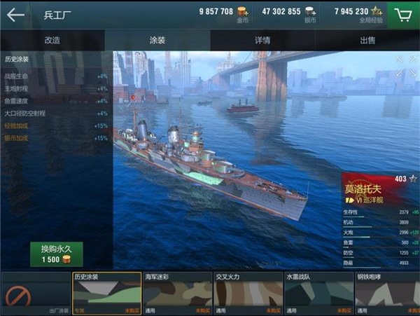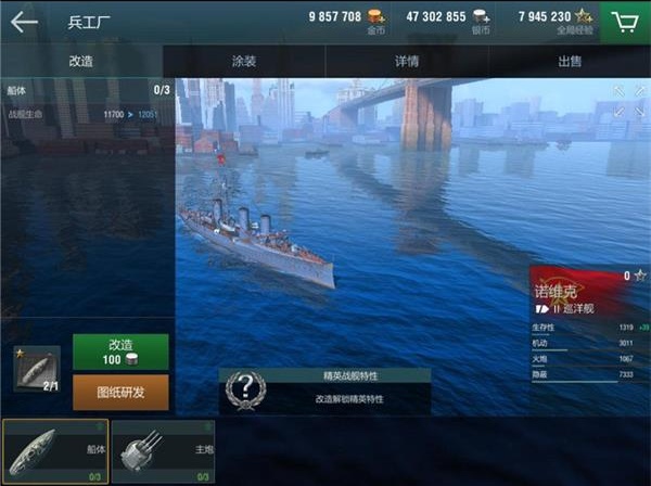 舰船升级的最重要渠道是兵工厂改造,玩家在此可以对舰船的船体、主炮、鱼雷等部件进行改造,可以永久性提升战舰的性能!全部改造完成后,战舰便会升级为精英战舰,可以选择一项特殊属性。战舰改造需消耗银币和部件蓝图,蓝图可通过战斗获取、升级奖励、商店购买等方式获得。
