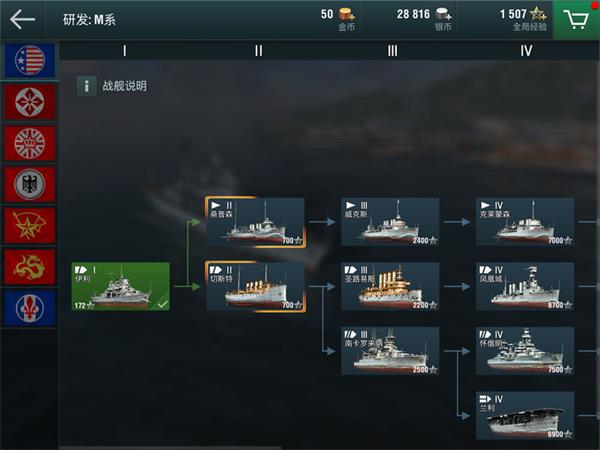 其中的M、R、D、Y和S五系形成了自己的科技树,玩家在进入游戏将获得五艘Ⅰ级战舰,正式开启自己的海战生涯。