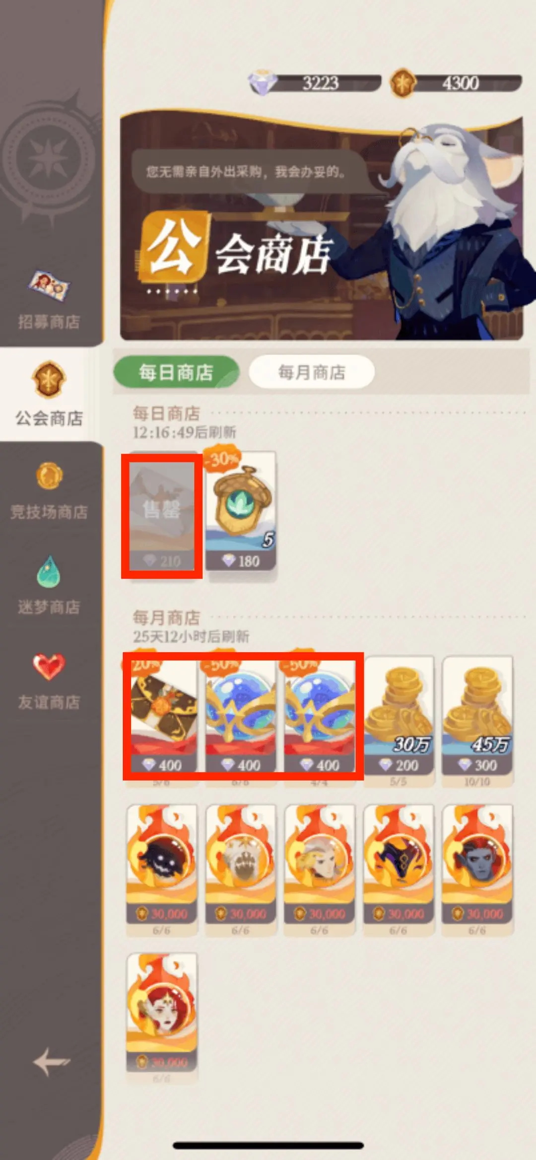 每日,公会商店:打折商品,每月商品看自己钻石量,神魔兑换,如果没有自己心意的阵容,建议兑换雷内亚