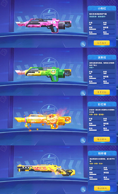 除了人物装扮外,你甚至可以在游戏里为自己的爱枪涂上缤纷的色彩!比如金色系的“法老”装扮,还有萌系可爱的“破坏兔”装扮,以及粉嫩的“兔美美”装扮。值得注意的是,这些武器都要从武器幸运箱中开出来,有一日限定、三日限定、七日限定和永久装扮这四种。能不能永远拥有这些可爱的装扮,就看大家的运气啦!