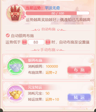 运势越高遇到知己几率越大,所以想要尽快的把知己都带走的话可以通过点击游玩左下角的【运势签】来提高当前的运势哦,布施可以使用银两+2点运势、另外还可以使用元宝转运使当前运势+10呢~此外在布施页面可以设置【自动布施】,勾选自动布施后会在每次游玩过后自动将运势补充至设定值。运势每15分钟恢复1点,且只能回复到90点。