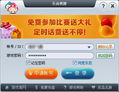已有乐尚棋牌帐号的玩家再次登录平台时,只要正确输入帐号及密码,点击“登录”即可。登录时可以在填写登录信息时勾选“记住密码”项(如图五),再次登录时无需输入密码,直接点击“登录”按钮即可进入游戏。但为保护你的帐号安全,切勿在公共场合使用该项功能,包含但不限于以下场合:公用计算机、网吧等。