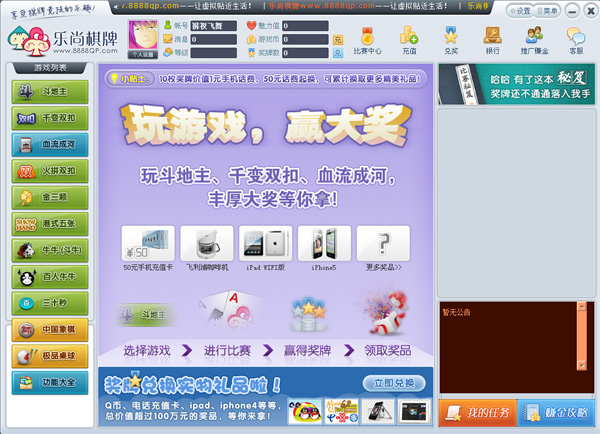 正常登录“乐尚棋牌游戏”平台后,在左边的“游戏列表”(如图六)中选择您想进入的游戏种类。进而选择“普通场”或是“比赛场”,点击“进入”或是“报名”即可进入到游戏大厅。
