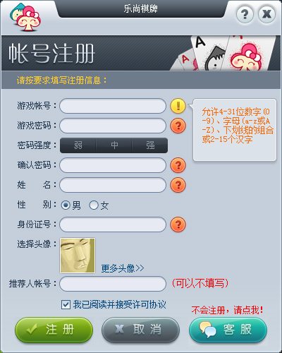 点击桌面“乐尚棋牌”的快捷方式进入“游戏登录”界面(如图四),点击左下角的“免费注册”按钮,进入“帐号注册”界面(如图五),填写相关信息。注册成功后,即可登录游戏平台了。