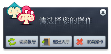 当您想离开游戏时,直接点右上角的关闭按钮。这时会出现退出游戏对话框(如图九)。如果点击“切换帐号”,可以进入“游戏登录”页面(如图四),可以尝试另一帐号登录;如果点击“退出大厅”,则退出游戏;如果选择“取消操作”则退回到游戏大厅,重新继续游戏。