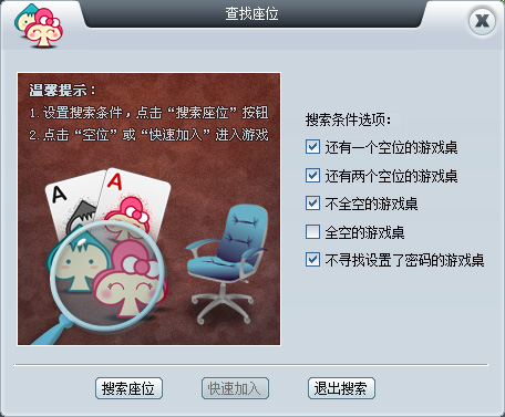 您还可以直接选择游戏大厅里面的“快速加入”功能项,点击该项下面的“查找座位”按钮。通过设置一定的“搜索条件”搜索座位(如图八),同样可以快速找到适合的“游戏空位”。