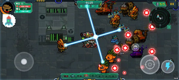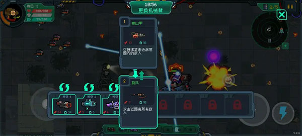 击败第二个 Boss(约十几级)后进入中期。此时应操控红色机甲持续移动,避免停留,以防任务失败或被敌人包围。利用高伤害火箭筒优先清除大型杂兵,同时积累资源。