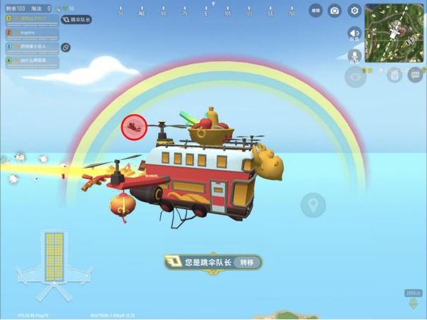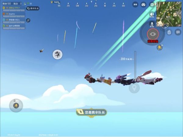 3、派对开始后,所有玩家乘坐飞行巴士飞过派对地图上空,玩家通过点击屏幕上跳伞按钮,自由选择降落地点。(跳伞前可点击右上角地图,在大地图上点击标记落点)