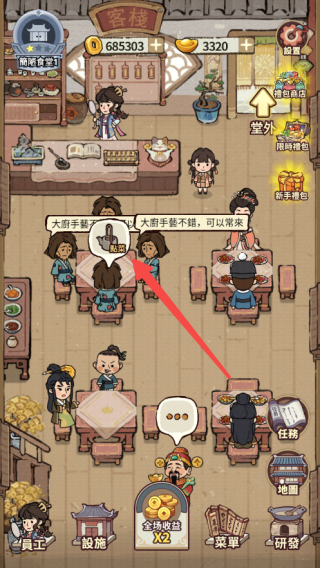 1、进入我在江南开客栈手游,等待客人上桌,点击点菜;