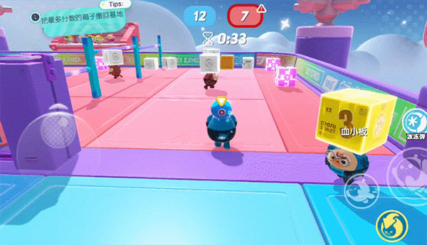 除此之外,我们还可以去到对方的场地干扰对手,不但可以扔道具扔蛋仔,还可以直接把场地上的方块拿走,变成己方的分数哦~