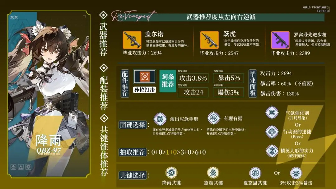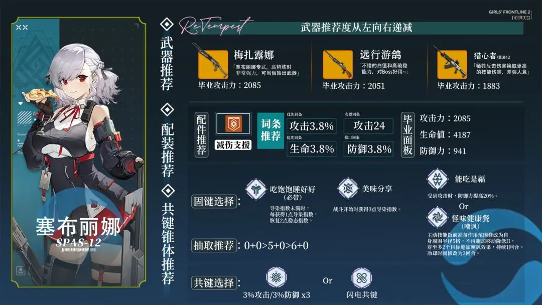 (P.s. 对于有多个可选固件的角色,如果不知道带什么就带左边的两个和右边最上面的一个XD)T1,托洛洛:托洛洛自从拥有春田和跃键以后就如同重获新生,强度非常高,以常驻角色的身份发挥着限定角色的实力,5椎完全体。