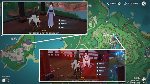 7、主线推进完后就是探索的环节了,可以按照开图的顺序,一个一个推图,也可以根据个人喜好决定可以等探索的差不多了可以选择去下面三张图雪山无前置;鹤观需要完成清籁岛大支线(清籁逐雷记);渊下宫需要完成海祇岛大支线(月浴之渊)