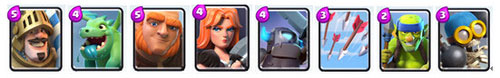 【推进流卡组(低杯段)】:王子+飞龙宝宝+巨人+瓦基丽武神+迷你皮卡+万箭齐发+哥布林投矛手+炸弹兵