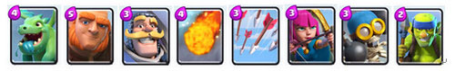 卡组特点:均衡型卡组,圣水消耗低,下兵节奏快,阵容转换时间短;攻守能力均衡,但都不突出;对时机把握、操作水平要求较低;较惧怕对方王子偷家之类的战术。